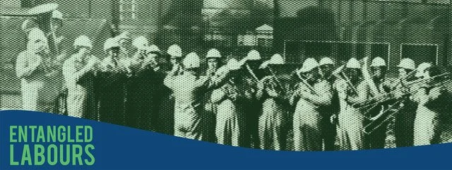 An aged black and white photo showing a group of twenty industrial workers dressed in jumpsuits and construction hard hats while playing brass instruments including Tubas, Trumpets, Trombones, Baritones, Euphoniums and Tenor Horns outside of a factory.