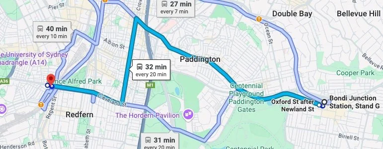 Woodburn Creatives can also be accessed via buses that travel along Cleveland Street. The 352 bus, which travels between Bondi Junction Station and Marrickville Metro, stops at the closest bus stops to Woodburn Creatives, a two-minute walk from the venue. The bus route from Bondi Junction Station to Woodburn Creatives is shown on the map below.
