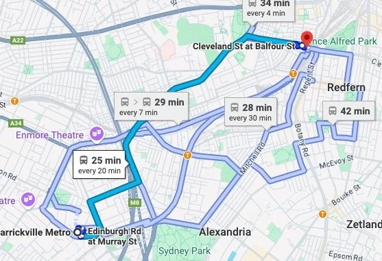 The 352 Bus Route from Marrickville Metro to Woodburn Creatives is shown on the map below.