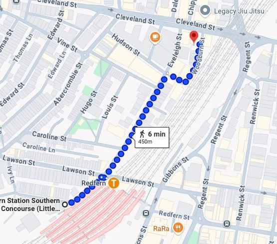 The closest station to Woodburn Creatives is Redfern Station with lift access from platforms 1-10 to the Little Eveleigh Street Exit. Woodburn Creatives is approximately a 6-minute walk (450 m) from the accessible Little Eveleigh Street Exit as shown on the map below.
